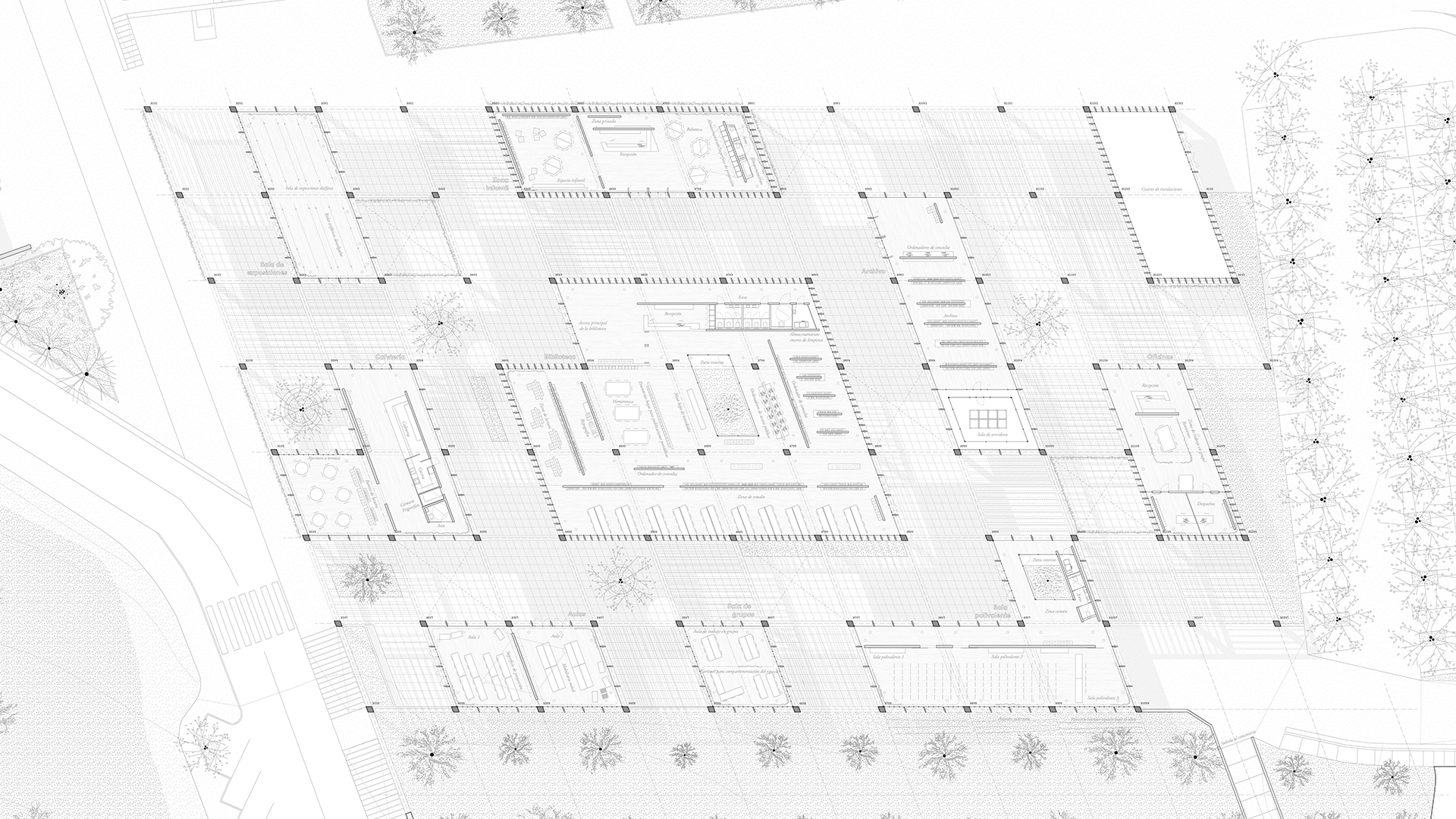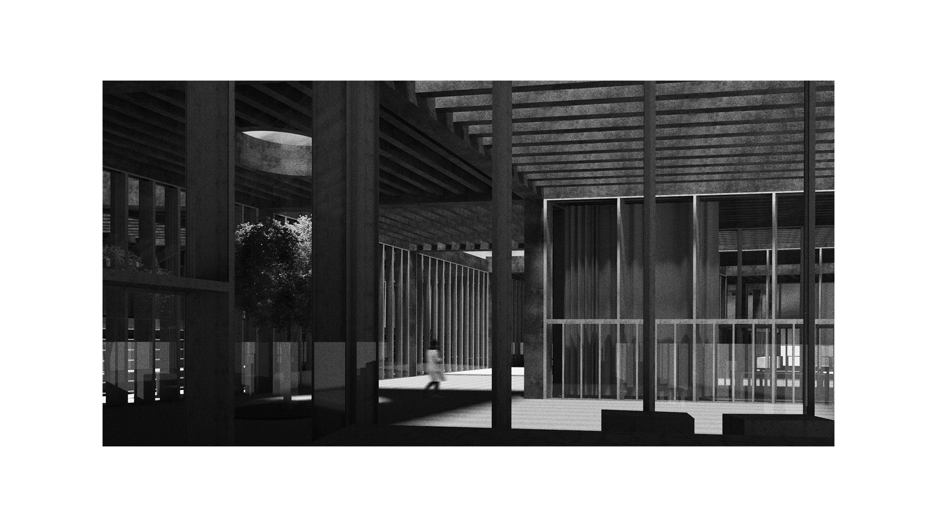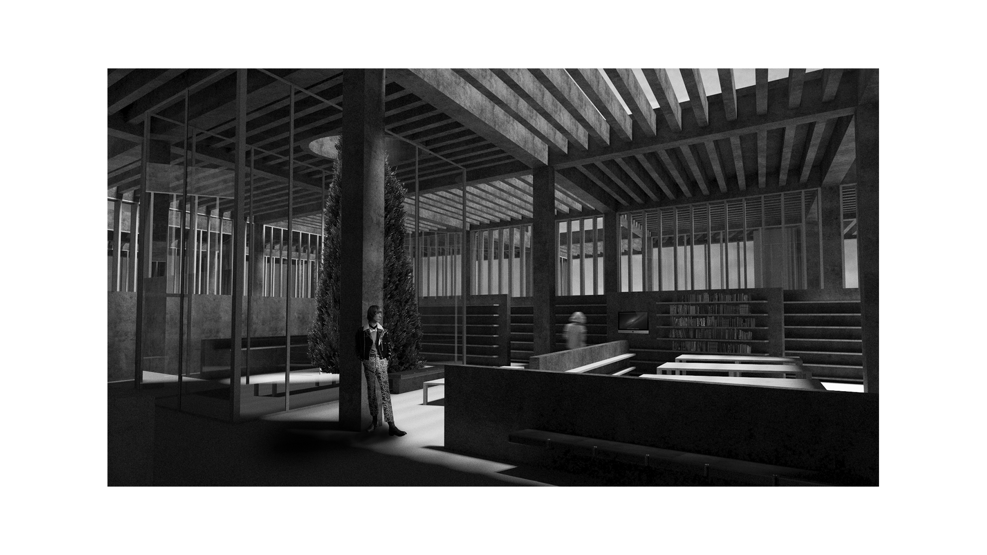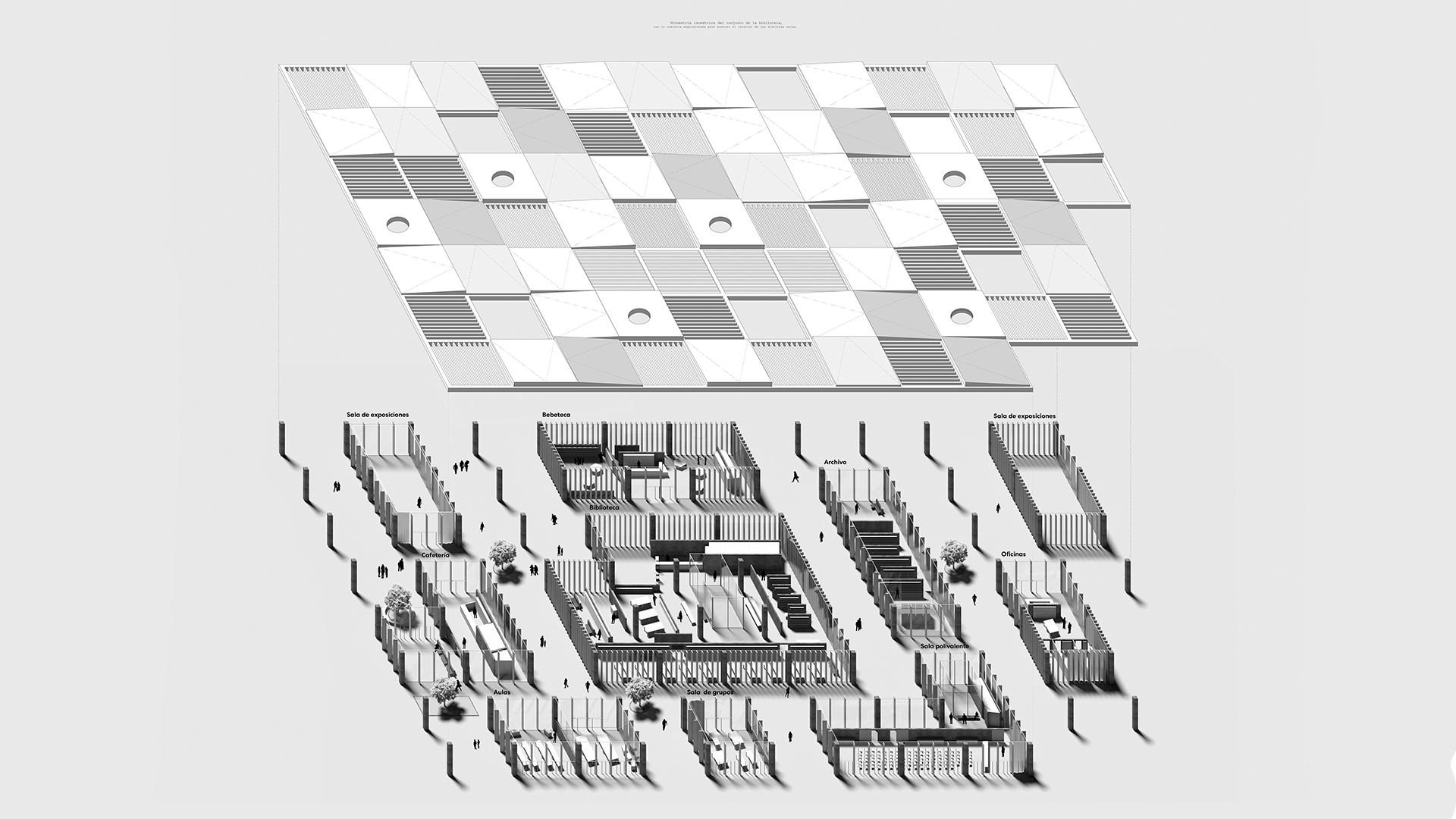 Espacios abiertos y cerrados se funden bajo un manto de sol y sombra, diluyendo la frontera entre interior y exterior. El estudio de soleamiento y proyección de la sombra da como restultado una serie de módulos base cuyas características permiten ocupar el espacio bajo ellos de diferentes maneras. De esta forma, la composición del proyecto resulta de la combinación y variación de estas bases para generar diferentes atmósferas que pueden ser dentro o fuera, basándose en las necesidades programáticas. Los espacios intersticiales de la biblioteca crean y sugieren nuevas formas de recorrer sus caminos, de forma que la interconexión en planta del proyecto venga generada por su sección vertical.