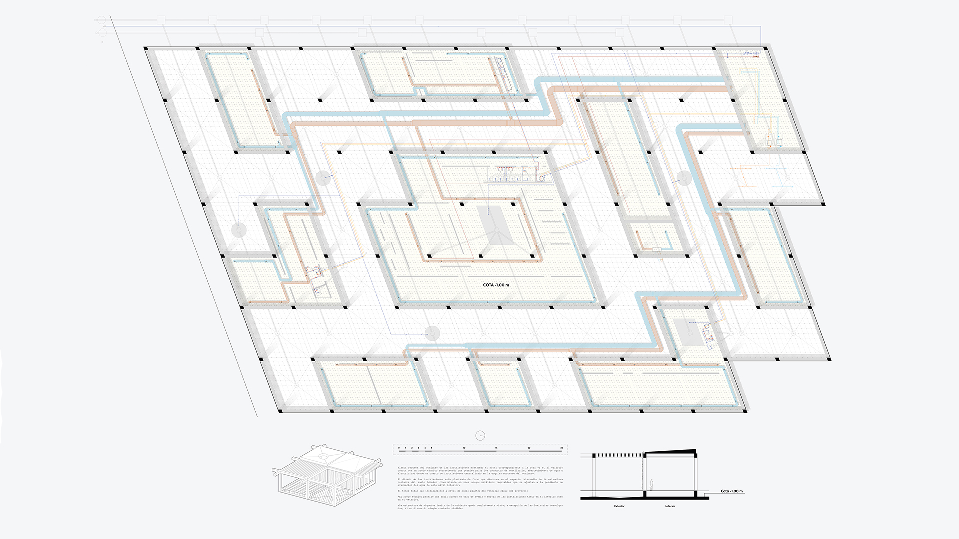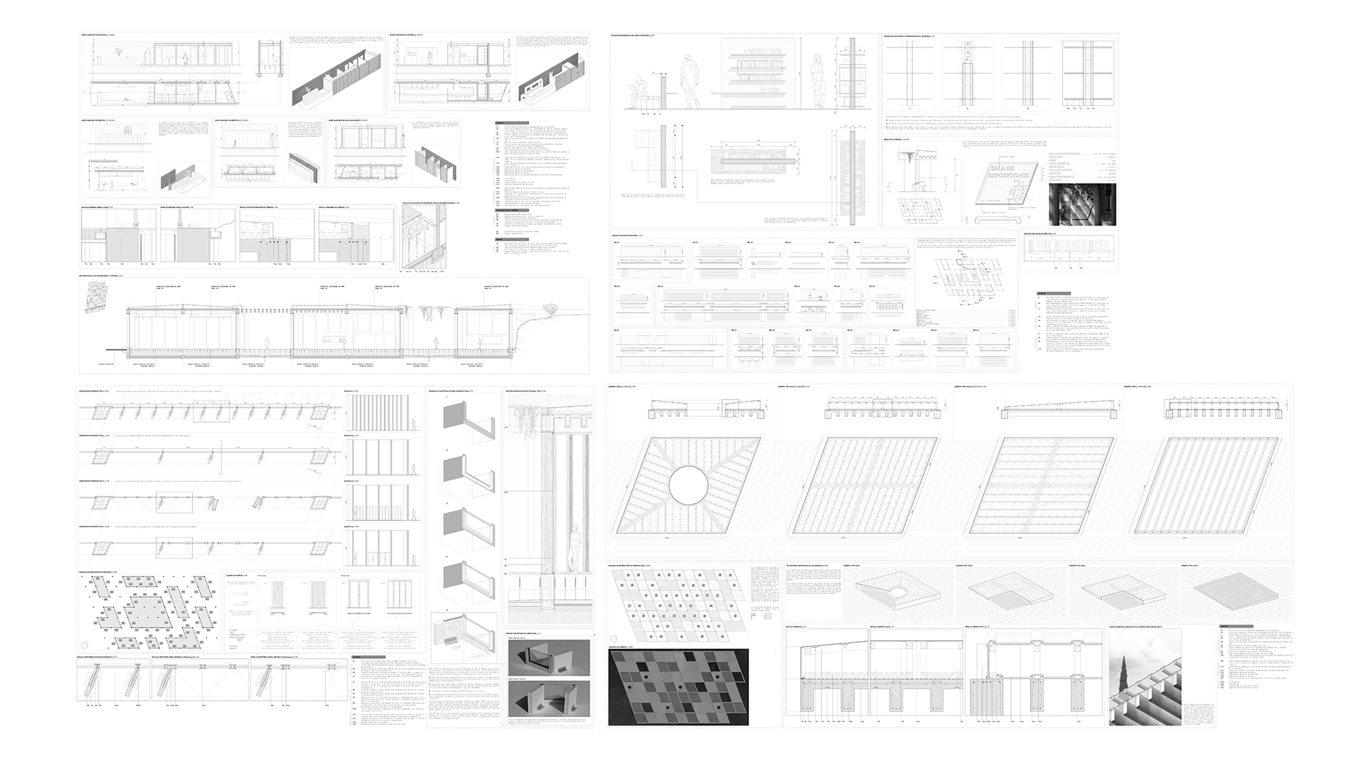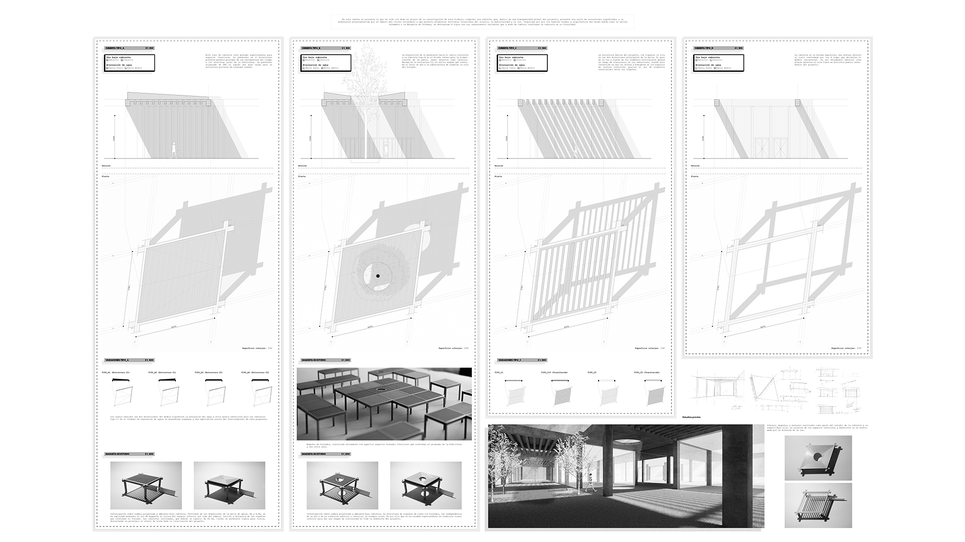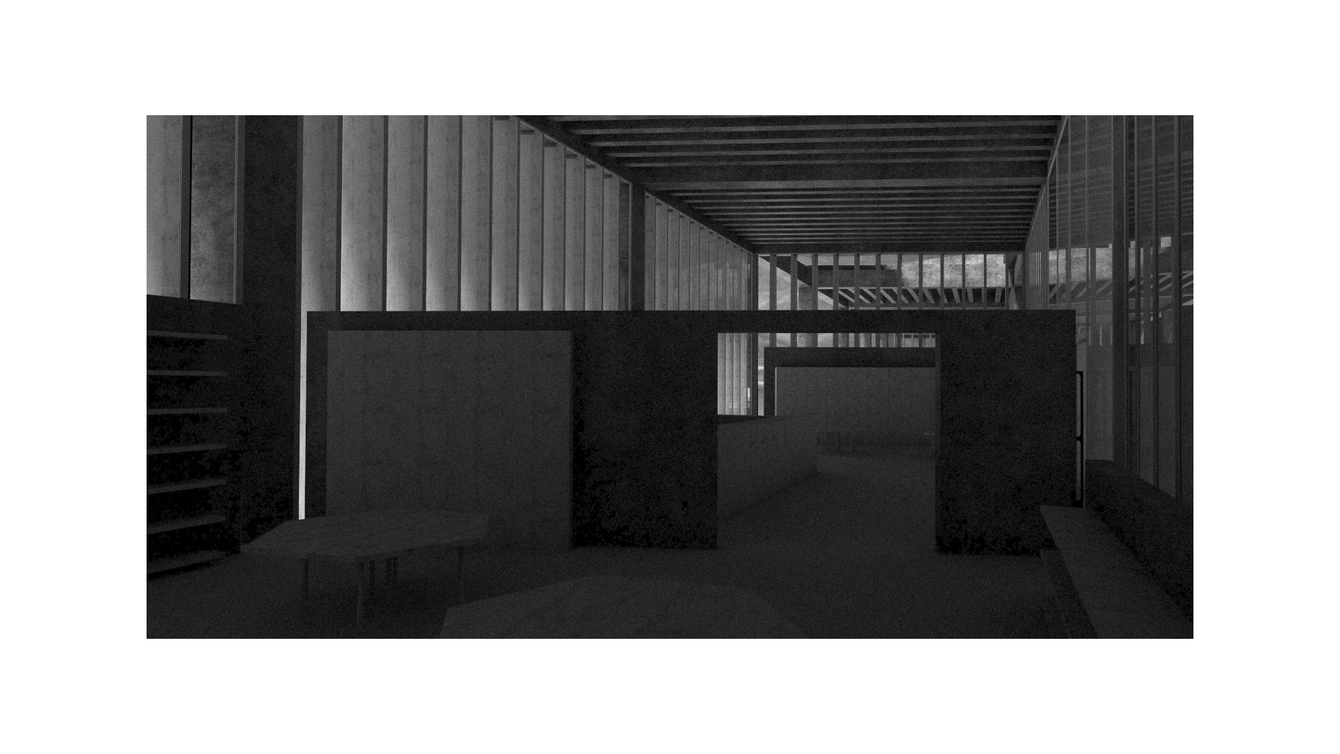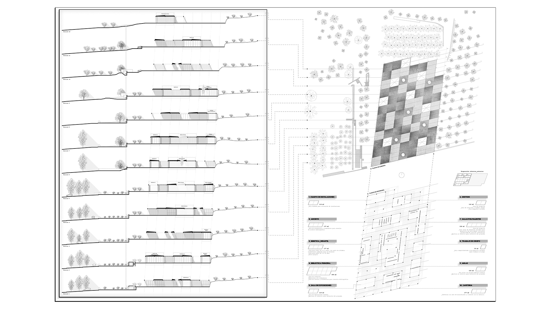 Espacios abiertos y cerrados se funden bajo un manto de sol y sombra, diluyendo la frontera entre interior y exterior. El estudio de soleamiento y proyección de la sombra da como restultado una serie de módulos base cuyas características permiten ocupar el espacio bajo ellos de diferentes maneras. De esta forma, la composición del proyecto resulta de la combinación y variación de estas bases para generar diferentes atmósferas que pueden ser dentro o fuera, basándose en las necesidades programáticas. Los espacios intersticiales de la biblioteca crean y sugieren nuevas formas de recorrer sus caminos, de forma que la interconexión en planta del proyecto venga generada por su sección vertical.